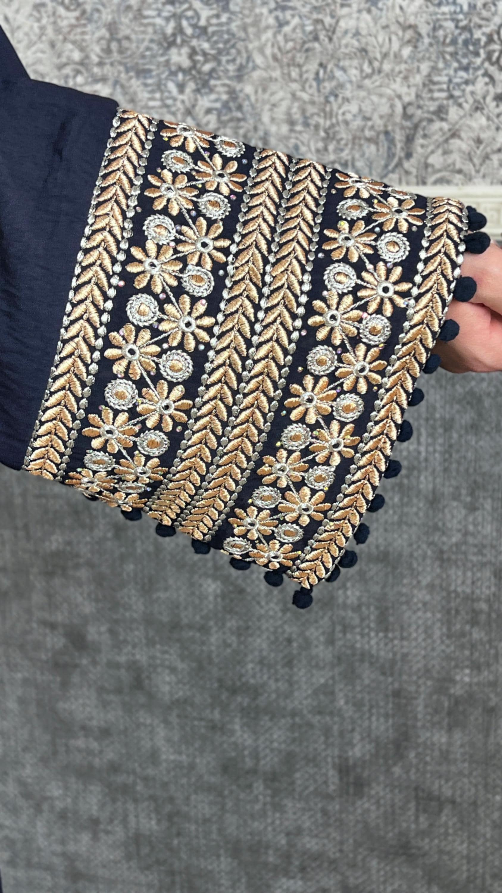 Dieses marineblaue Damenkleid vereint zeitlose Eleganz mit vielseitigem Komfort und ist in zwei Größen erhältlich: Größe 1 (S-L) und Größe 2 (L-2XL). Die weite Passform macht es zu einer perfekten Wahl für verschiedene Körperformen. Es besticht durch seine exzellente Verarbeitung und die harmonisch abgestimmte Stickerei, die dem Kleid eine edle Note verleiht. Der seidenähnliche Stoff fühlt sich angenehm leicht an und sorgt für höchsten Tragekomfort. Ideal für festliche Anlässe, besondere Tage, Henna-Zeremonien, Geburtstage, Abschlussfeiern und den Empfang von Gästen.