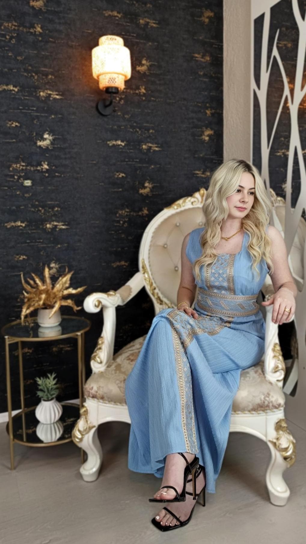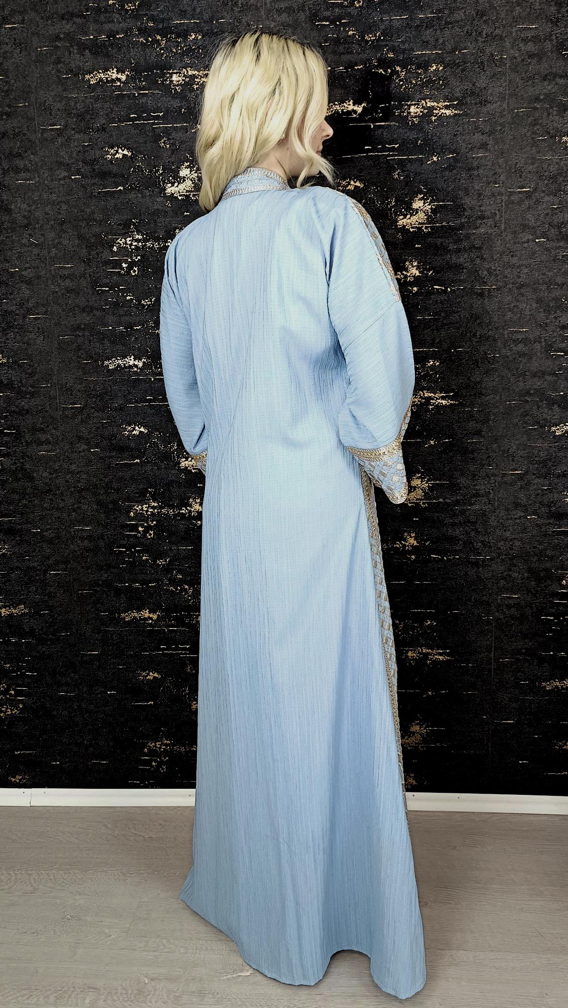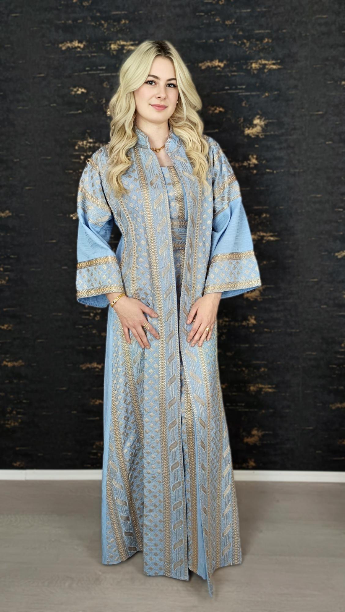 Kaftan "Königliches Modell" – Hellblau mit edler Stickerei Dieser luxuriöse Kaftan besticht durch seine seltene hellblaue Farbe und aufwendige Stickereien, die ihn zu einem echten Blickfang machen. Die Kombination aus traditioneller Eleganz und modernem Design macht ihn perfekt für besondere Anlässe. ✨ Details: