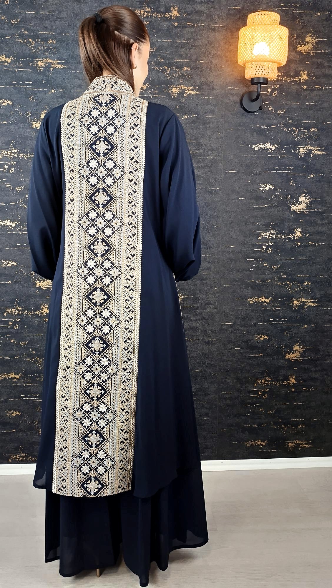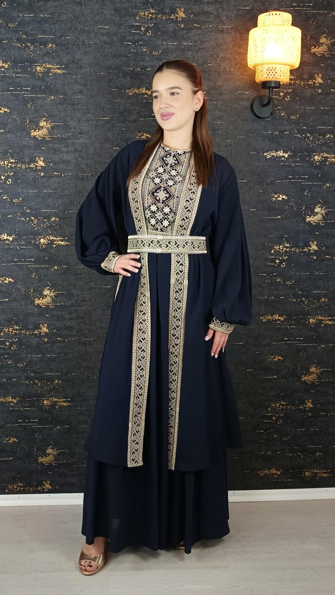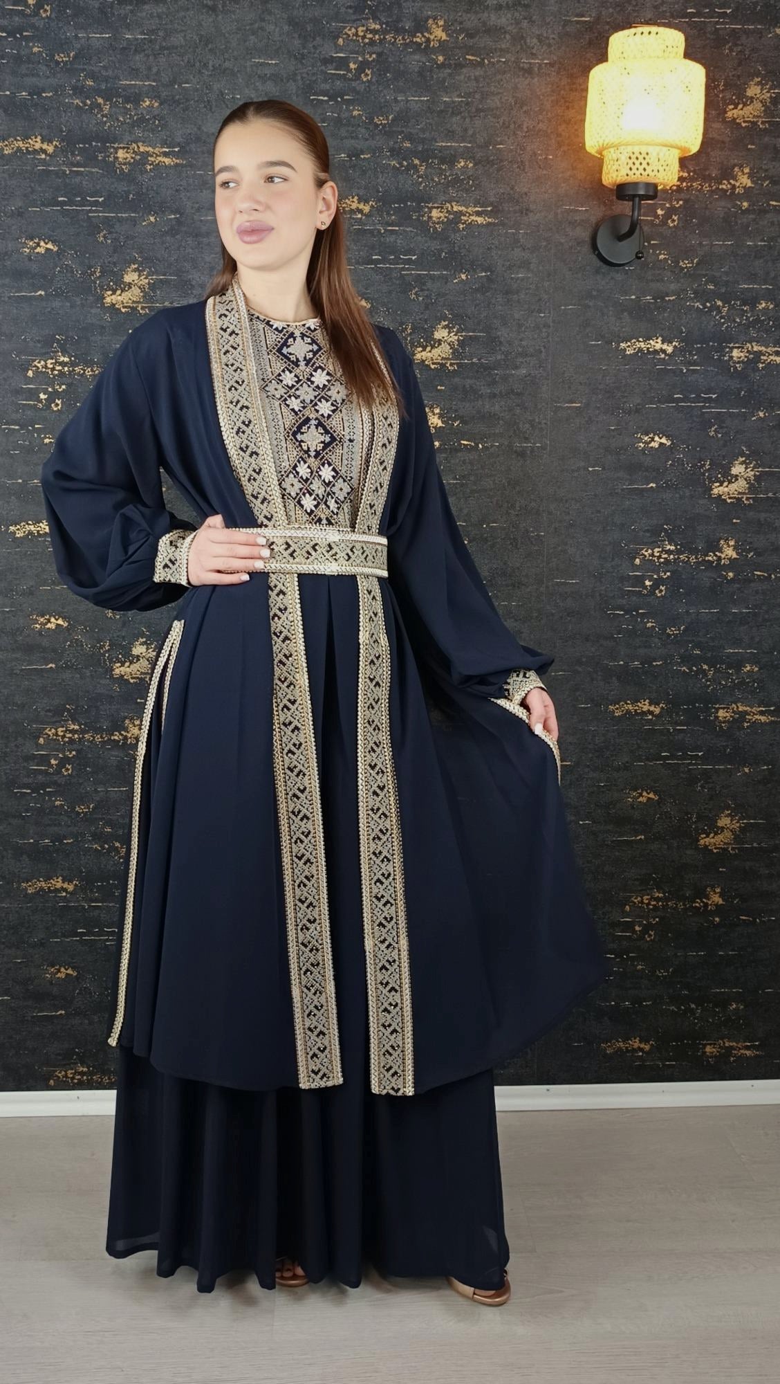 „Dieser exklusive Kaftan besteht aus zwei stilvollen Teilen und einem passenden Gürtel in edlem dunkelblau. Das Set setzt sich aus einem ärmellosen Kleid mit weitem, fließendem Schnitt und einer eleganten Überwurfjacke zusammen, die zusammen eine perfekte Silhouette bilden. Der Overall mit weit geschnittenen Hosenbeinen sorgt für eine elegante Ausstrahlung und gleichzeitig für höchsten Komfort. Die kunstwollen, detailreichen Stickereien verleihen dem Outfit einen luxuriösen Akzent und betonen die exquisite Handwerkskunst. Dieses Kaftan-Set vereint traditionellen Stil mit modernem Chic und ist die perfekte Wahl für gehobene Anlässe. Erhältlich in den Größen 1 bis 5 (entsprechend S bis XXL), bietet es eine ideale Passform für jede Figur.“