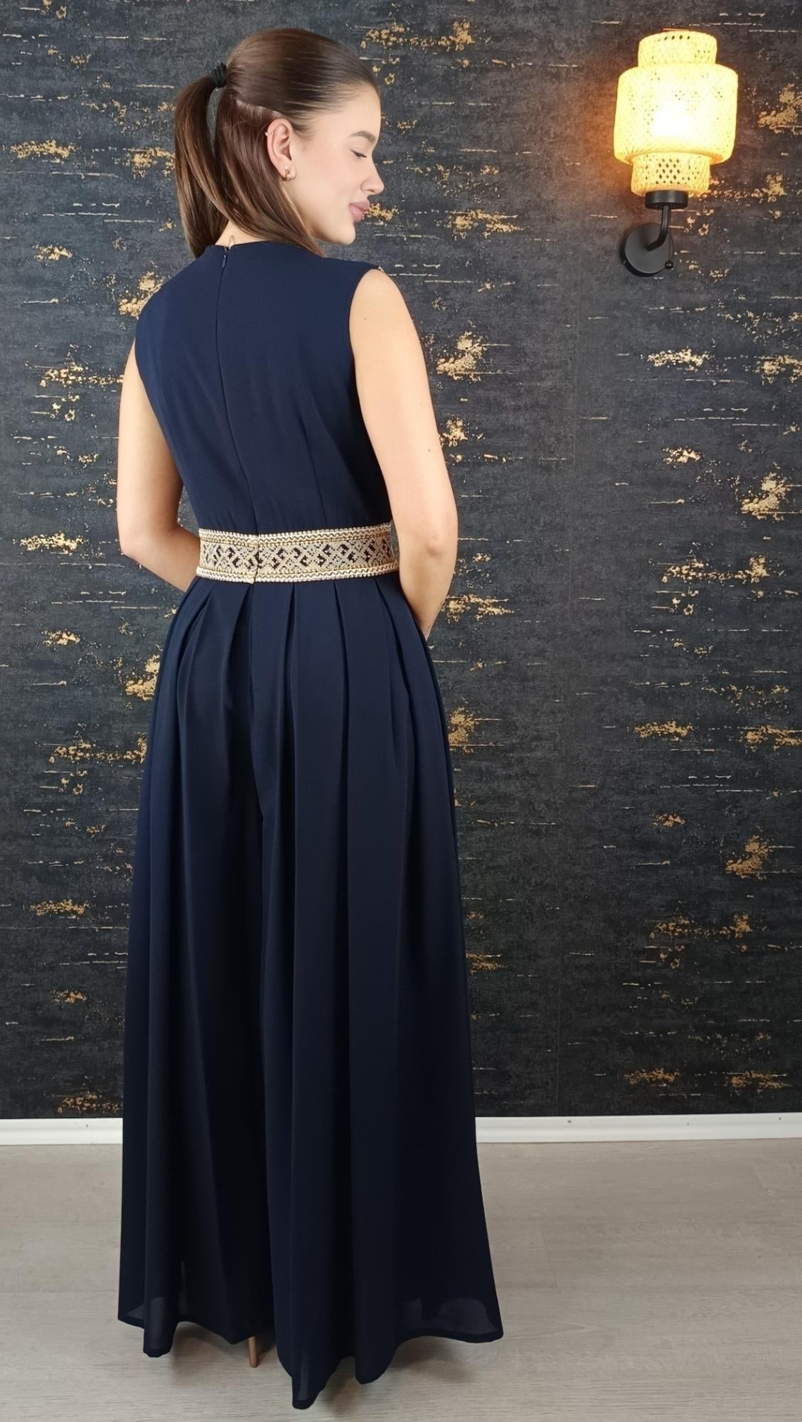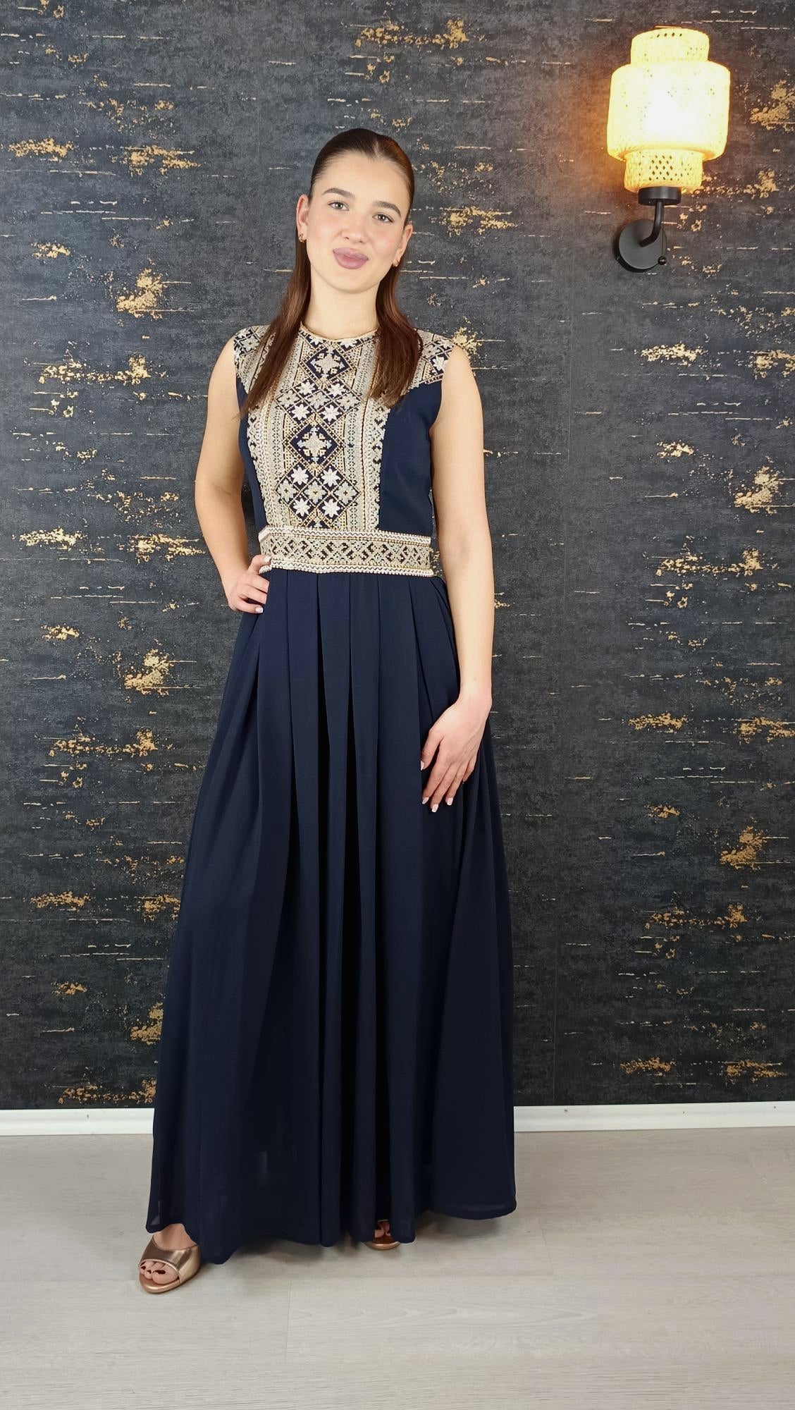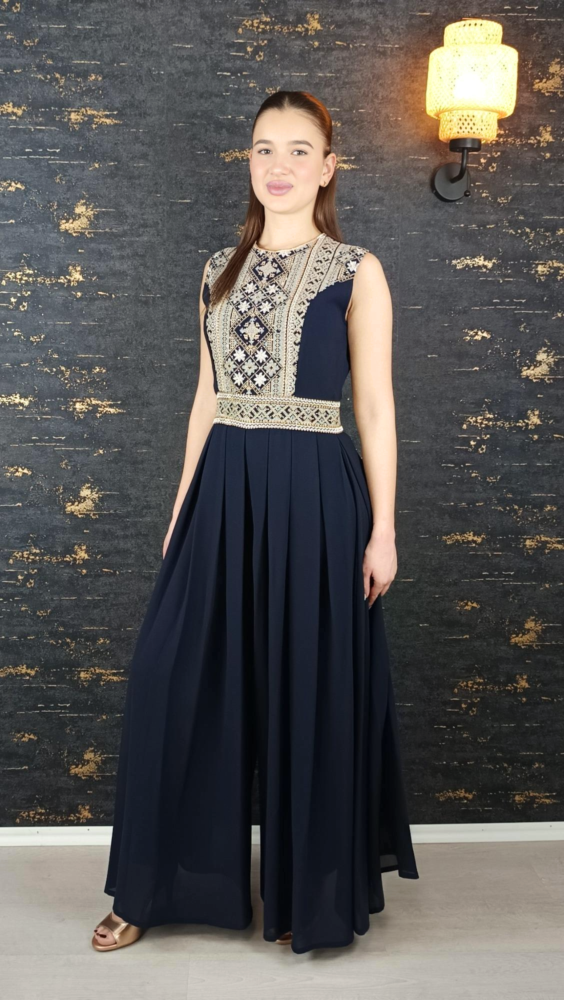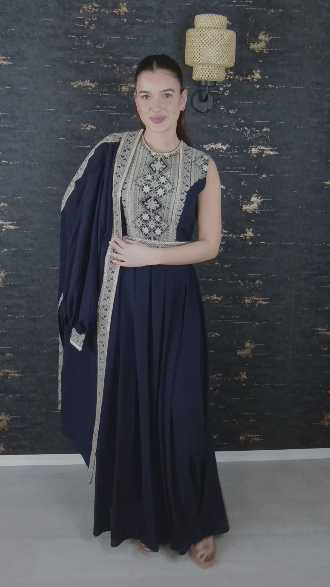„Dieser exklusive Kaftan besteht aus zwei stilvollen Teilen und einem passenden Gürtel in edlem dunkelblau. Das Set setzt sich aus einem ärmellosen Kleid mit weitem, fließendem Schnitt und einer eleganten Überwurfjacke zusammen, die zusammen eine perfekte Silhouette bilden. Der Overall mit weit geschnittenen Hosenbeinen sorgt für eine elegante Ausstrahlung und gleichzeitig für höchsten Komfort. Die kunstwollen, detailreichen Stickereien verleihen dem Outfit einen luxuriösen Akzent und betonen die exquisite Handwerkskunst. Dieses Kaftan-Set vereint traditionellen Stil mit modernem Chic und ist die perfekte Wahl für gehobene Anlässe. Erhältlich in den Größen 1 bis 5 (entsprechend S bis XXL), bietet es eine ideale Passform für jede Figur.“