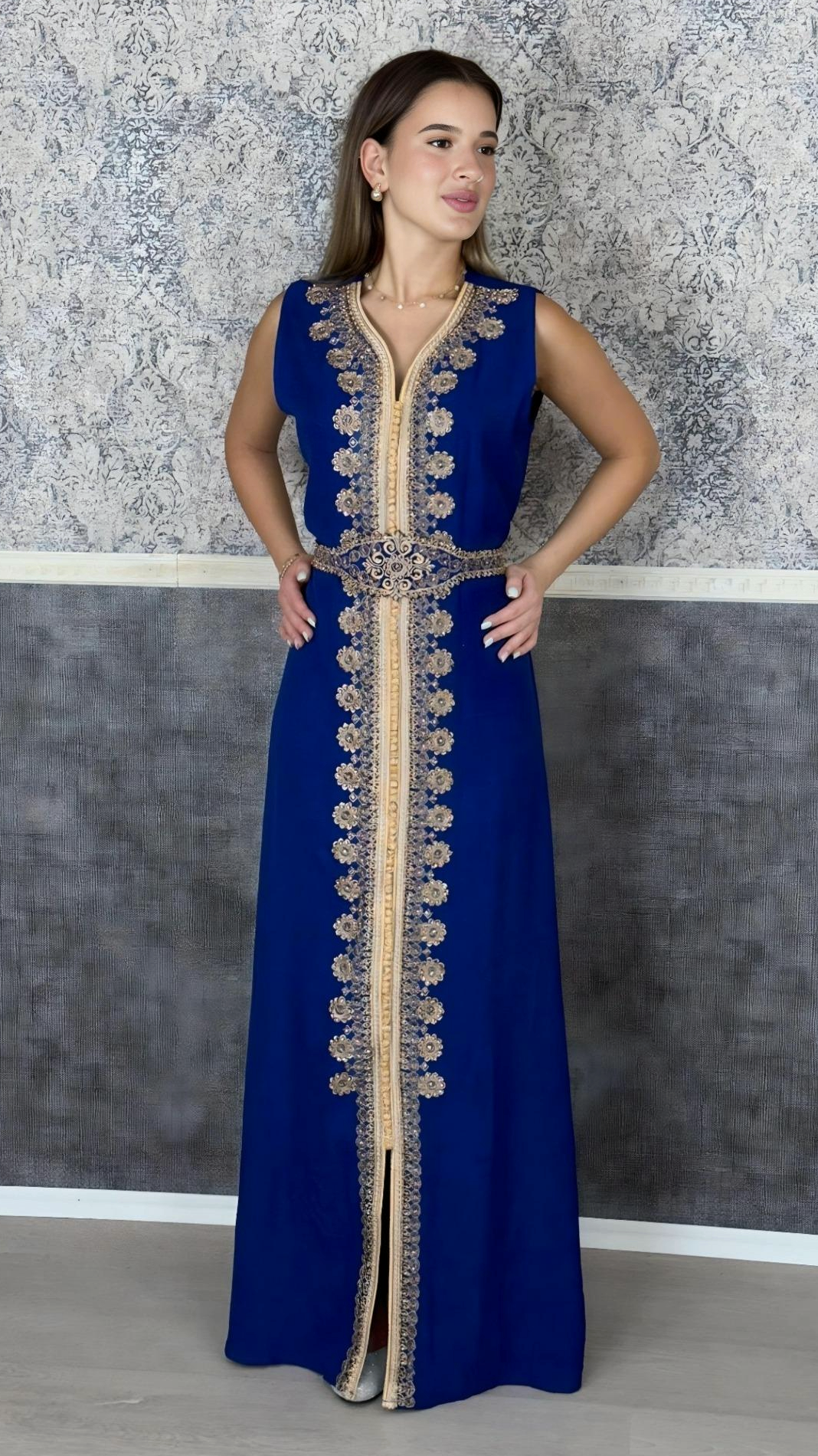 Entdecken Sie unseren exklusiven Kaftan in einem tiefen, strahlenden Blau, ein wahres Kunstwerk, das traditionelle Eleganz mit luxuriösem Glanz vereint. Dieses atemberaubende Kleidungsstück, bestehend aus zwei Teilen, wird durch kunstvolle Stickereien und handgenähte Diamanten veredelt, die ihm eine besondere Raffinesse und einen Hauch von Glamour verleihen. Die funkelnden Diamanten, die sorgsam entlang des Kragens, der Ärmel und des Saums platziert sind, verschmelzen harmonisch mit dem edlen Blauton des Stoffes und lassen den Kaftan in vollem Glanz erstrahlen.