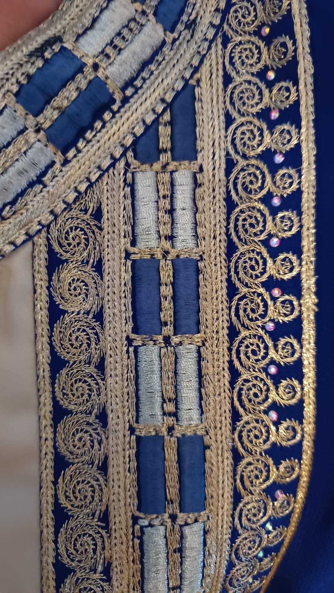 ✨ Edler Zweiteiler für unvergessliche Auftritte ✨ Erlebe zeitlose Eleganz neu – mit diesem exklusiven zweiteiligen Kaftan-Set, bestehend aus einem fließenden Jumpsuit und einem prachtvoll bestickten Übermantel. Das Ensemble vereint klassischen Stil mit modernem Chic und macht dich zum strahlenden Mittelpunkt jeder Veranstaltung. Die kunstvoll eingearbeitete Stickerei in Silber- und Dunkelblau verleiht dem Look luxuriöse Tiefe, während der edle Königsblaue Stoff für eine majestätische Ausstrahlung sorgt. Der verstellbare Gürtel betont deine Taille und zaubert eine schmeichelhafte, feminine Silhouette – ideal für jeden Figurtyp. Ob zur Hochzeit, Verlobung, Familienfeier oder als elegantes Abendoutfit – dieser Kaftan ist dein perfekter Begleiter für ganz besondere Momente. Highlights: