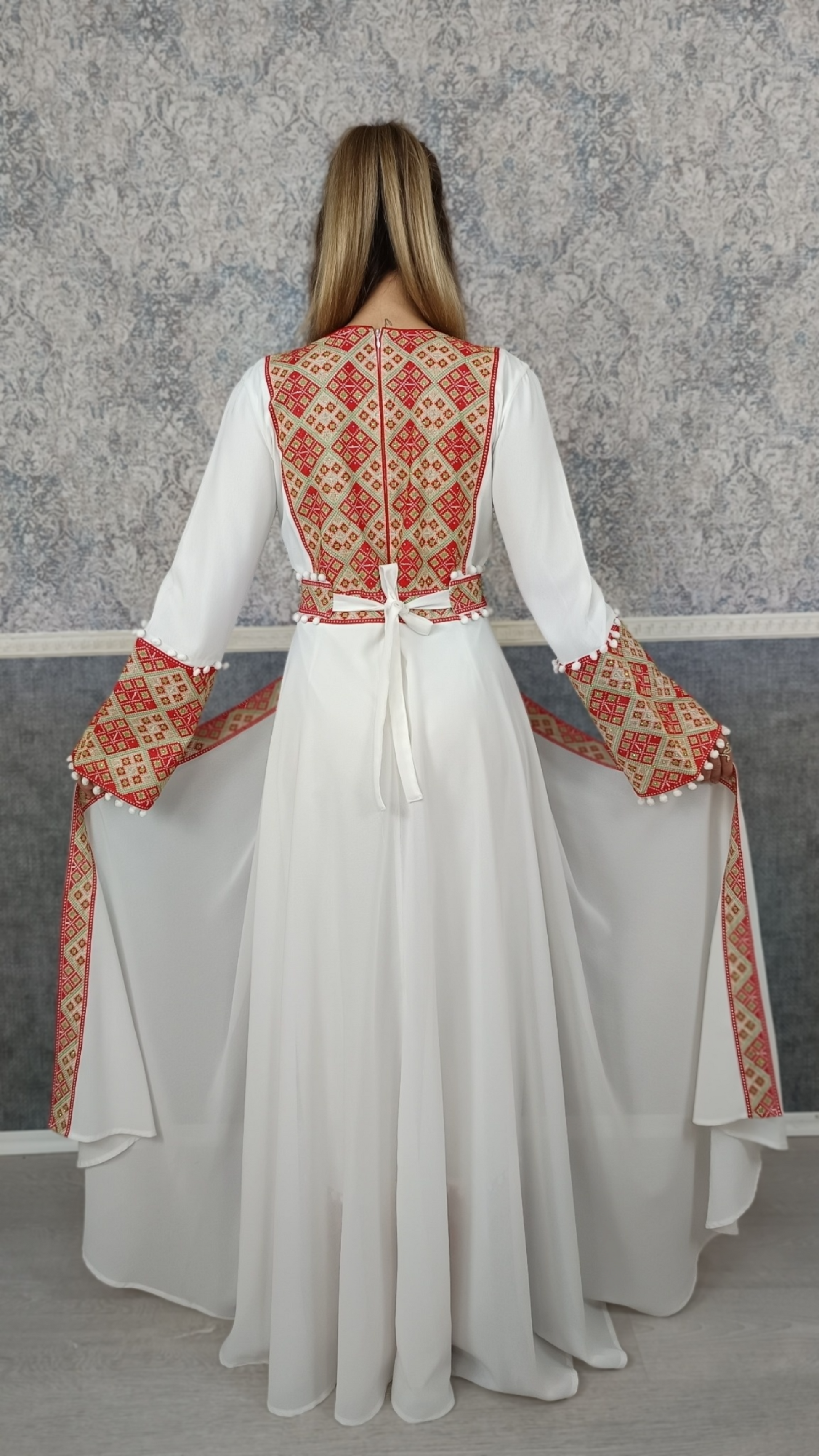 Dieses wunderschöne Modell ist in den Nummerngrößen 1 bis 5 erhältlich – entsprechend den Konfektionsgrößen XS, S, M, L und XL. Es ist sehr fein verarbeitet und mit kunstvollen Stickereien sowie Strasssteinen verziert. Der Stoff hat eine seidenähnliche Optik und trägt sich leicht und angenehm.